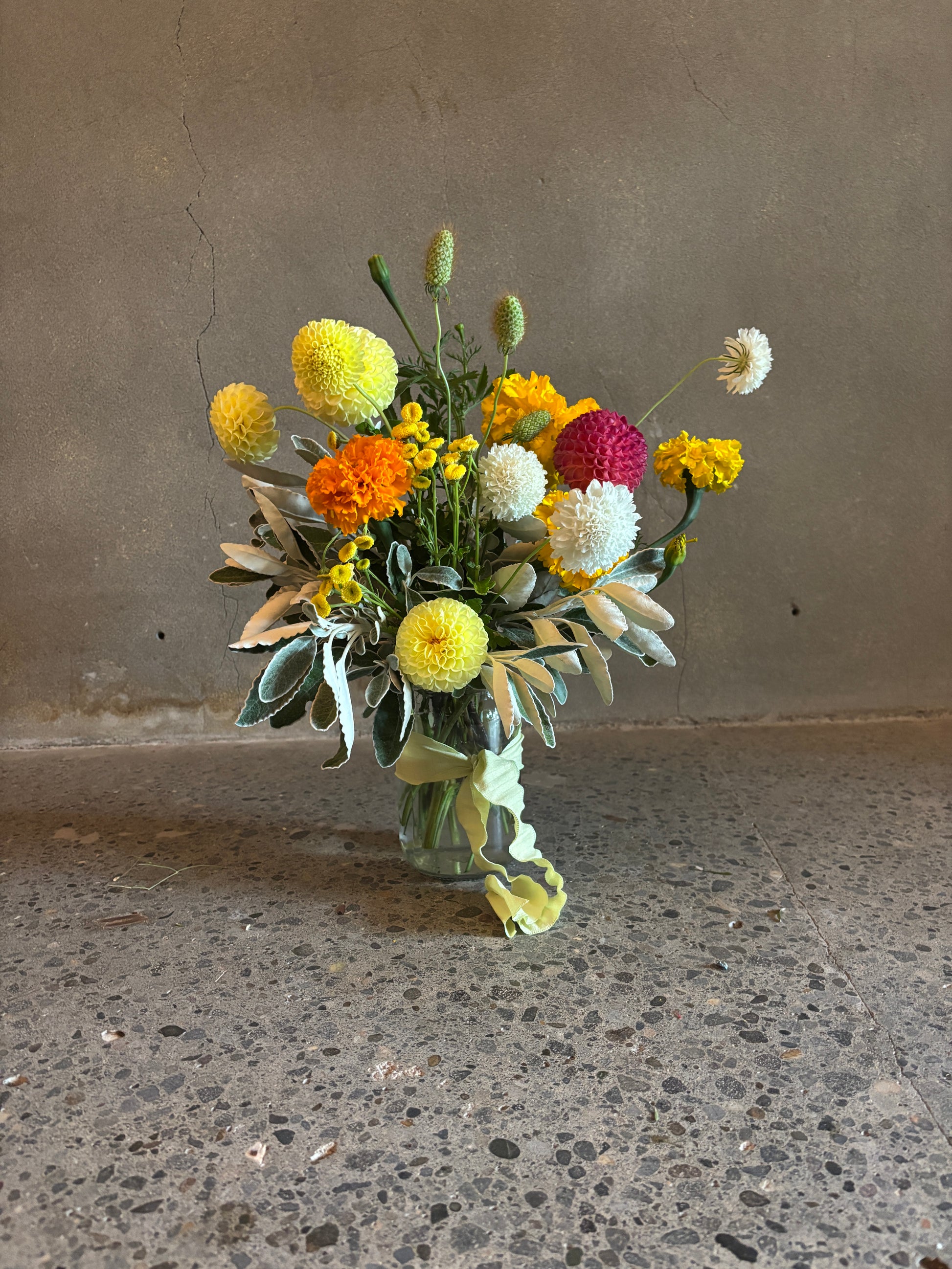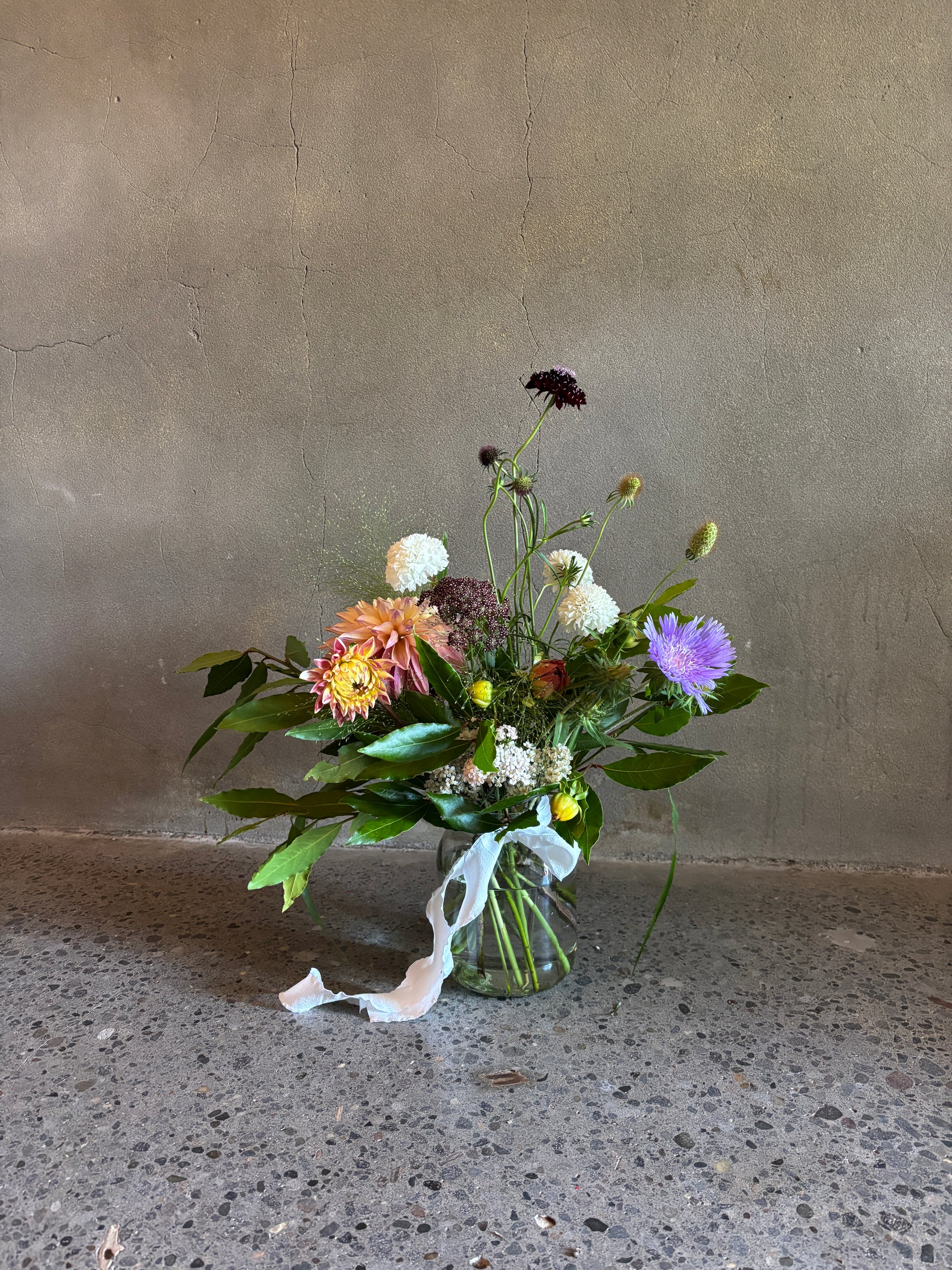 A pickle jar of seasonal florals, ready to go in water. The perfect option for on the go gifts, with no fuss needed.